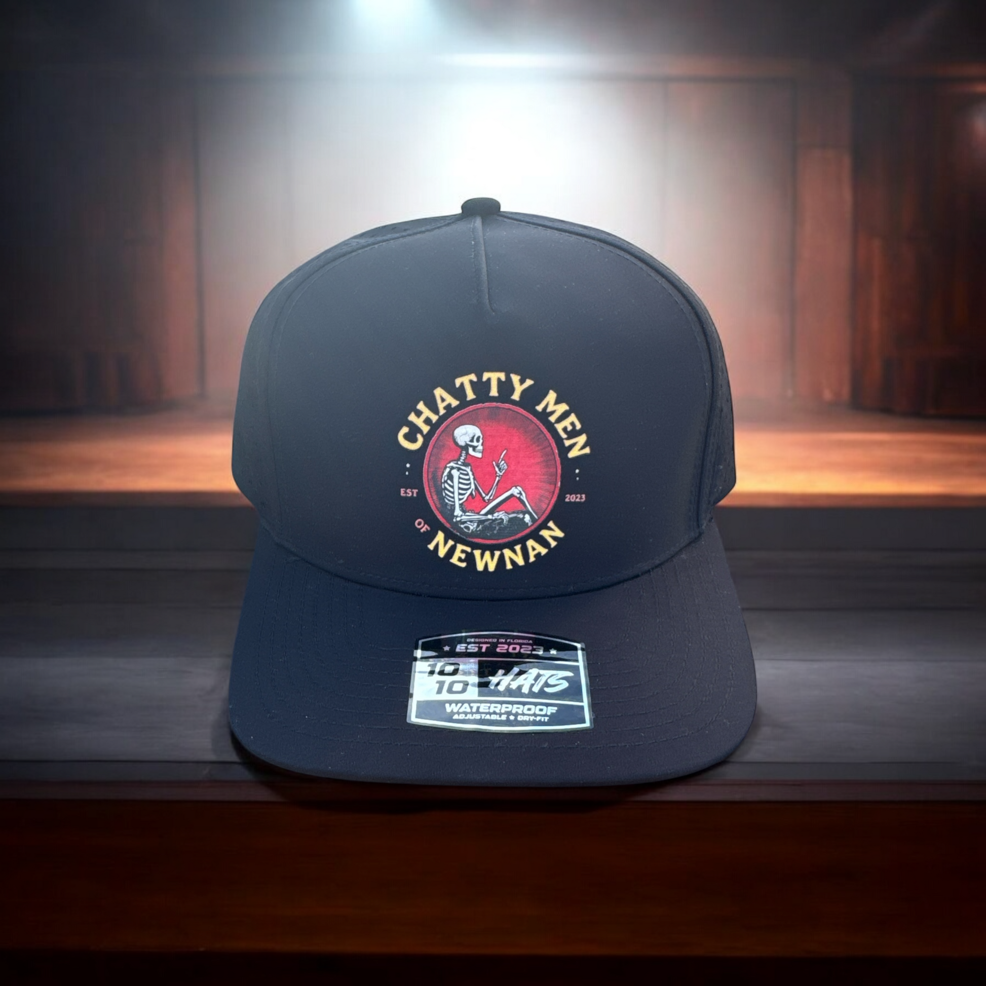 Talk about a conversation starter! This Chatty Men of Newnan hat features a red circle and a sitting skeleton. Perfect for those who love fun fashion and don't take themselves too seriously. Strike up a conversation with this playful accessory.